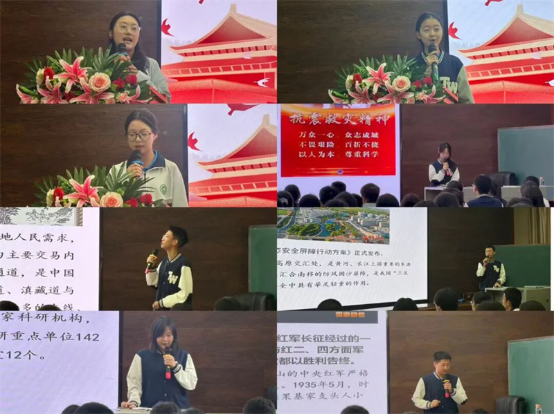 隨后,兩地學(xué)生代表進(jìn)行了交流發(fā)言,棠湖外國(guó)語(yǔ)學(xué)校學(xué)生代表從地域文化、成長(zhǎng)經(jīng)歷、民族情感等角度發(fā)言。蘭州民族中學(xué)唐銘駿同學(xué)對(duì)甘肅在古絲綢之路上的重要性及甘肅各民族同胞和諧共處、生生不息,共同建設(shè)的共有精神家園作了簡(jiǎn)要介紹。