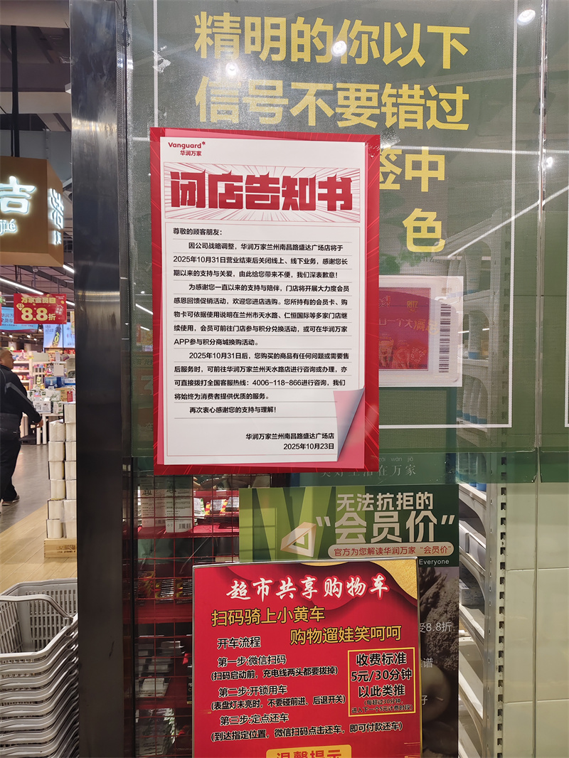 記者在門店入口位置看到了閉店公告,公告除說明閉店原因與時間外,還詳細標(biāo)注了消費者關(guān)心的權(quán)益接續(xù)問題。公告明確,消費者持有的華潤萬家會員卡、購物卡,可在蘭州市天水路店、仁恒國際店等多家華潤萬家門店正常使用,無須擔(dān)心卡內(nèi)余額作廢;會員積分可選擇到店兌換實物禮品,或通過華潤萬家APP在積分商城換購商品。